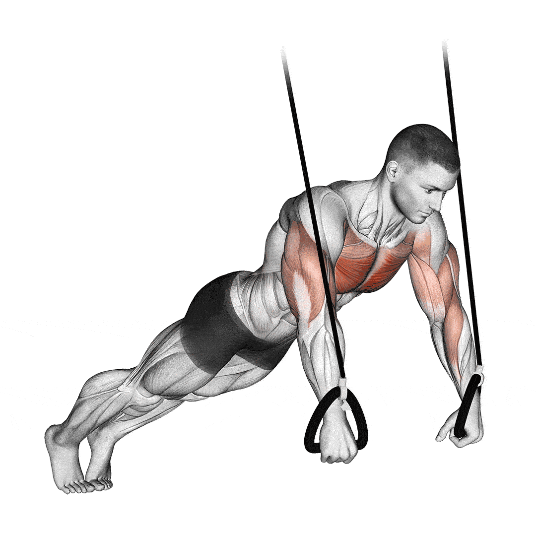 Это упражнение находится где-то между отжиманиями на кольцах и обычными отжиманиями. Руки находятся в рукоятках петель TRX, что требует очень интенсивного изометрического сокращения от дельт и предплечий для стабилизации.