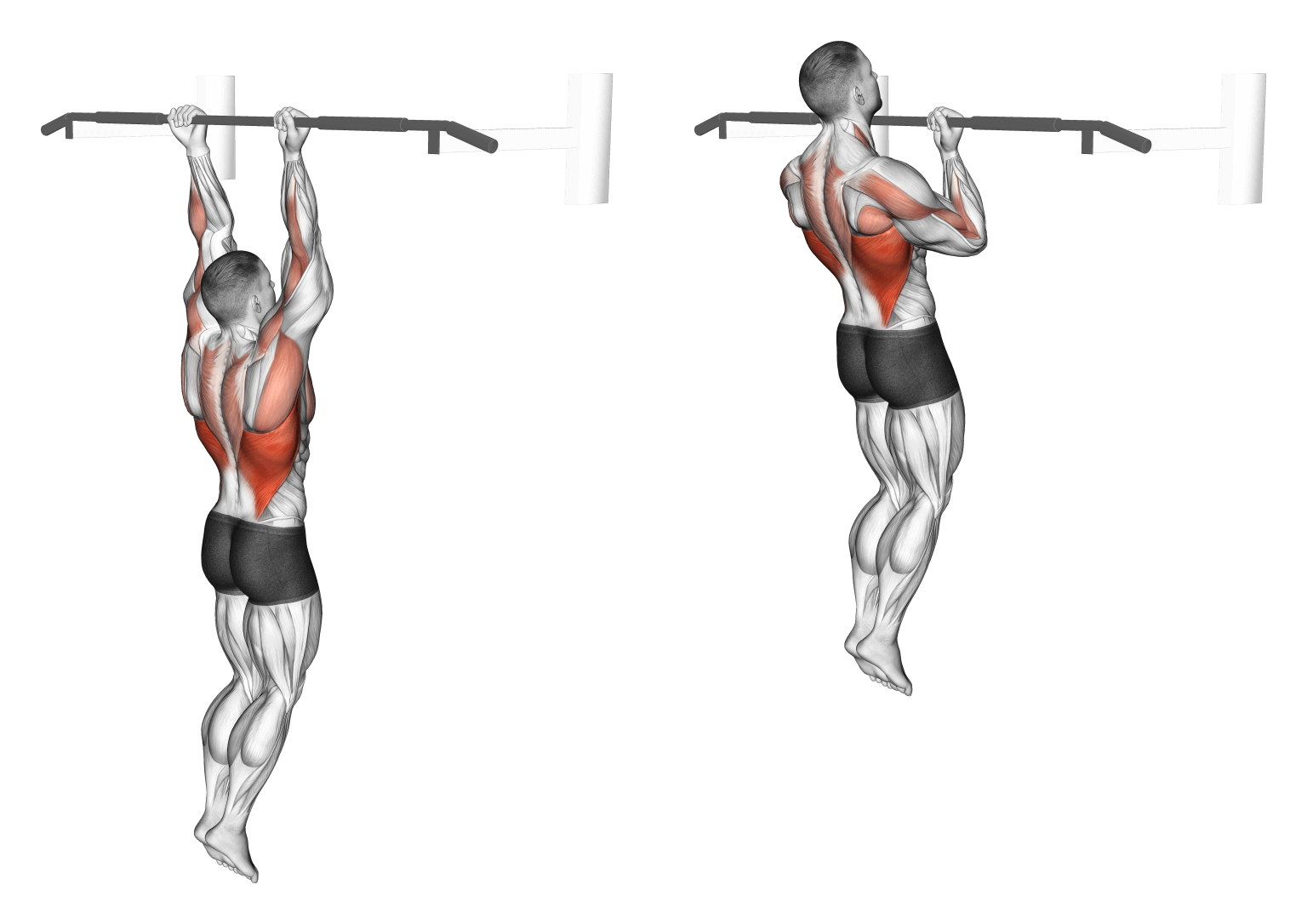 С более технической точки зрения, подтягивания обратным хватом — это многосуставное комплексное упражнение, которое использует сгибание локтей, сведение лопаток и частичное наружное вращение плеч для тренировки мышц рук и спины.