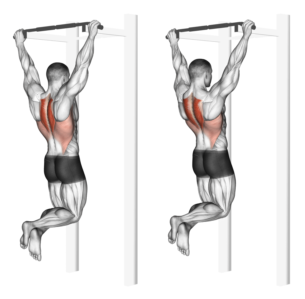 Широчайшие мышцы спины: Проходят от нижней части спины до плеча и отвечают за подтягивание тела к перекладине.