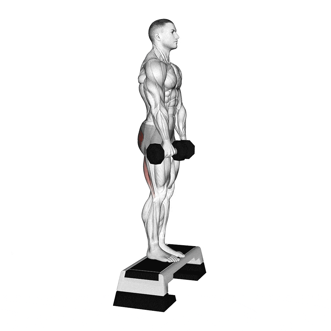 Стоя на возвышенной поверхности, атлет держит гантель в обеих руках. Как можно медленнее он выполняет повторение, скручивая позвоночник вперед, начиная с головы. Ноги должны оставаться прямыми.