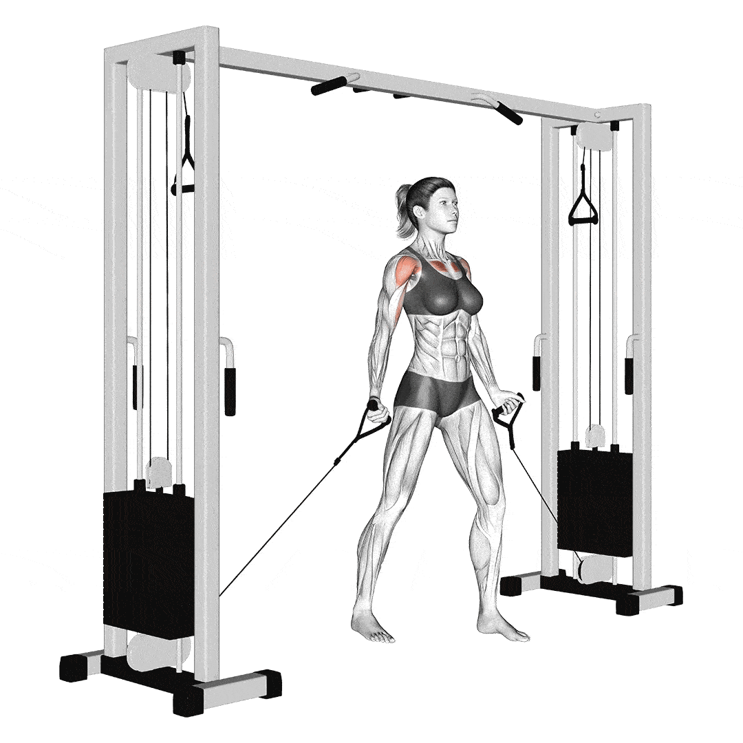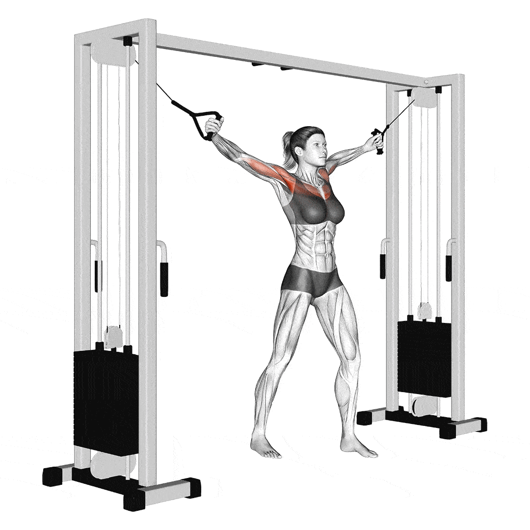 Атлет устанавливает блоки как можно выше. Затем, взяв рукоятки, он принимает сбалансированную и устойчивую позу, слегка наклонив корпус вперед, позволяя рукам разводиться под действием сопротивления тросов. Как всегда, сохраняйте легкий изгиб в локтях. С разведенными руками атлет затем сводит руки вместе, следуя углу, созданному тросами.