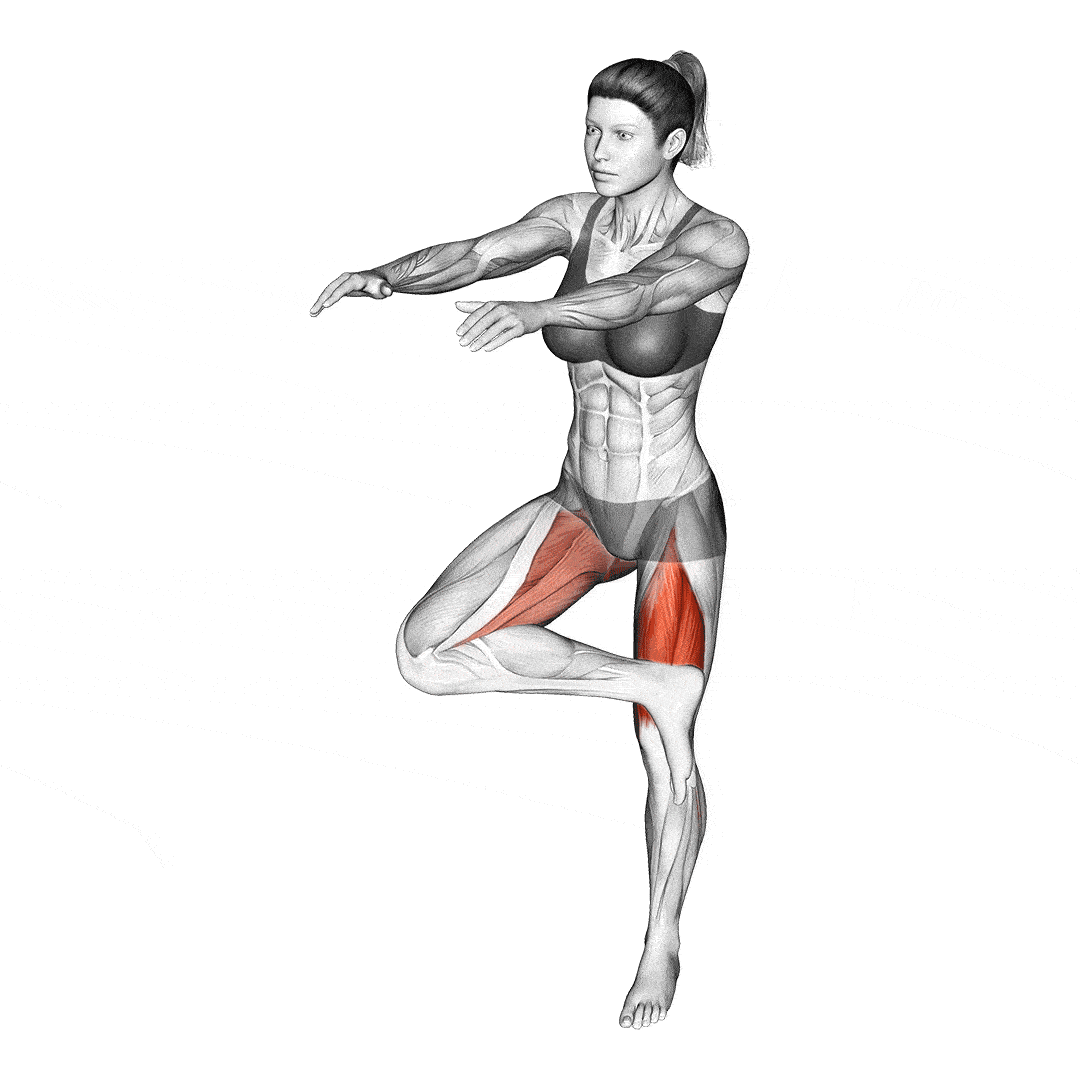Сгибайте опорное колено, опуская таз до параллели и ниже, держите поднятую ногу перед собой.