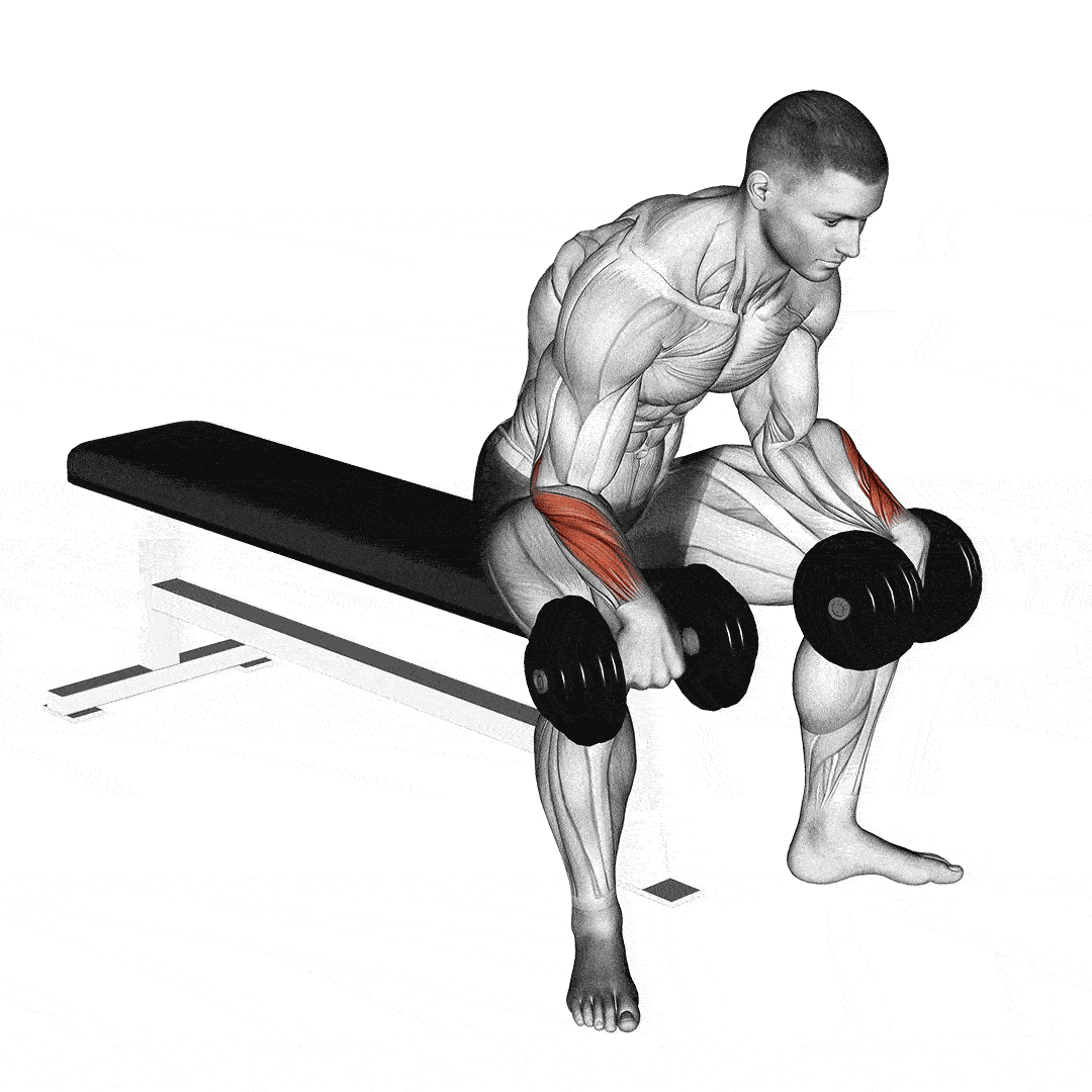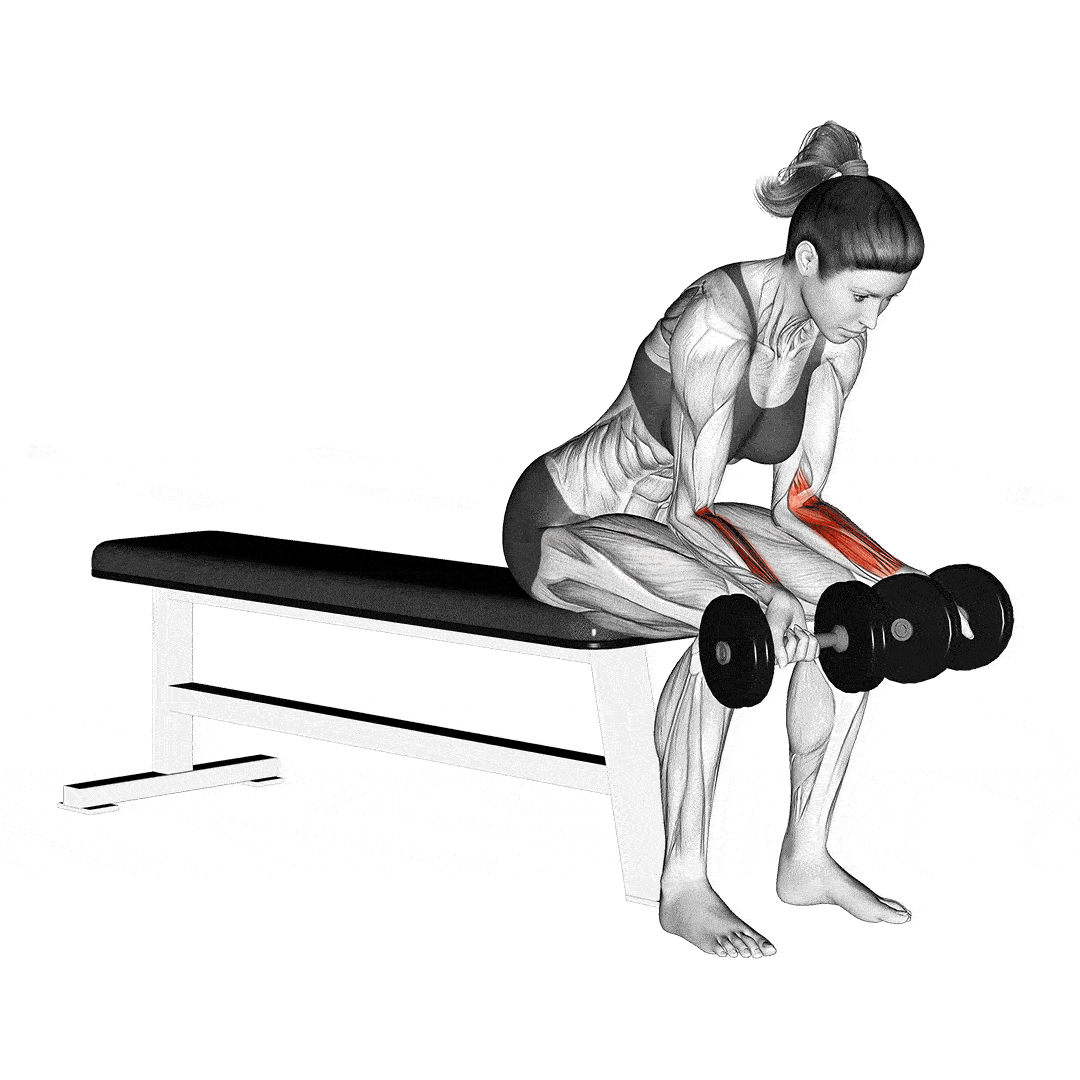 Как выполнять: Сядьте, положите предплечье на колено ладонью вверх. Удерживая гантель, позвольте кисти опуститься вниз, а затем мощным движением согните запястье, поднимая гантель вверх. Выполняйте движение медленно и подконтрольно.